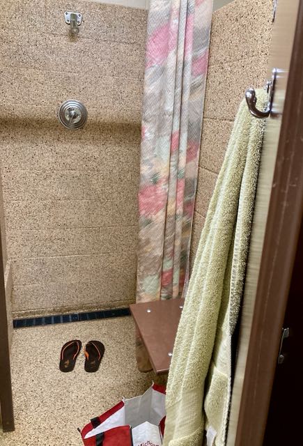 We’ve tried different totes and bags to find that a good-old goody bag like you get at RV shows works great to place your change of clothes and toiletries in. You really don’t want to stand in a public shower with your bare feet, so a cheap pair of flip-flops works best, and you can wear them from your site to the shower house. I try not to take a lot of items; for example, I use shampoo also as my body wash. But Karla takes everything she would use if she were showering in the trailer; she just takes smaller bottles. Of course, don’t forget a towel. Deodorant etc., can be applied back at the site or taken in the goody bag to the shower. Most shower houses have hooks inside the shower or right outside to set your clothes. But if not, we also found that since the goody bags are made of plastic materials and if there’s no bench, you can place the bag directly on the floor away from the shower spray. You wouldn’t be able to do that with other types of bags that could get wet.